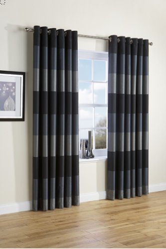 - Curtains have banded colours in coordinating shades of black, grey and silver.
